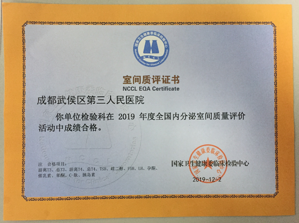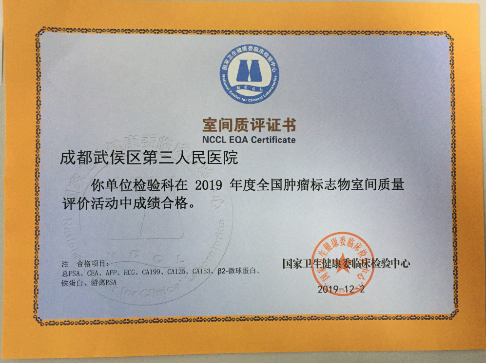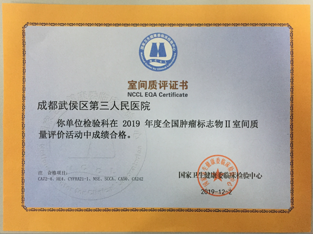 室间质量评价是保证临床检验的重要手段,其目的是相互校正各实验室测定结果的准确性,并发现实验室本身不易发现的不准确性,了解各实验室之间结果的差异,帮助其校正,使结果具有可比性,是实验室医疗安全的重要组成部分。 我院为进一步提高临床检验实验室的检验质量,在连续多年参加四川省临床检验室间质量评价的基础上,2019年我院检验科取得四川省及全国室间质评全部参评项目评价合格的优秀成绩。 通过室间质量评价活动,不断总结经验和提高检测技术,我院在检验质量上有了显著提高,为临床提供了更加准确的检验数据。