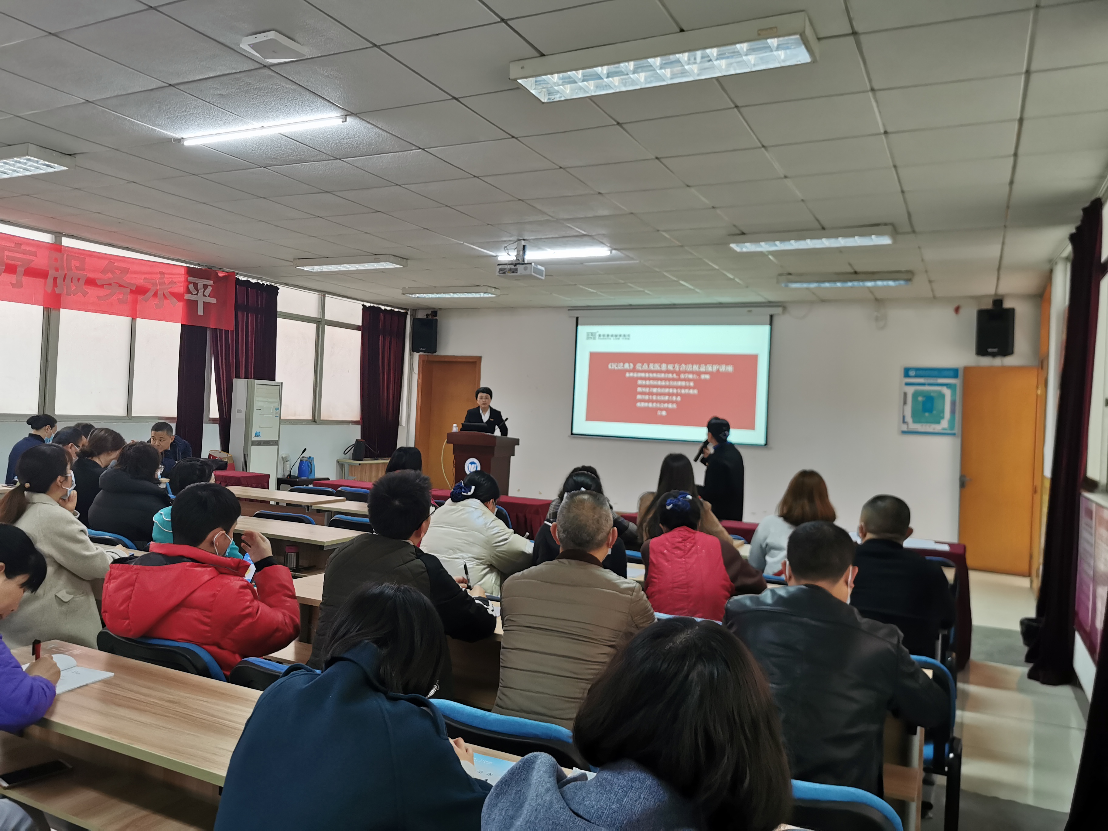为提升医院医护人员的法律素养和服务质量,2021年3月12日下午,我院组织开展了《民法典》学习培训会议, 培训会由副院长杜小兵主持,各科室主任、护士长以及部分青年骨干100余人参加了培训会议。
